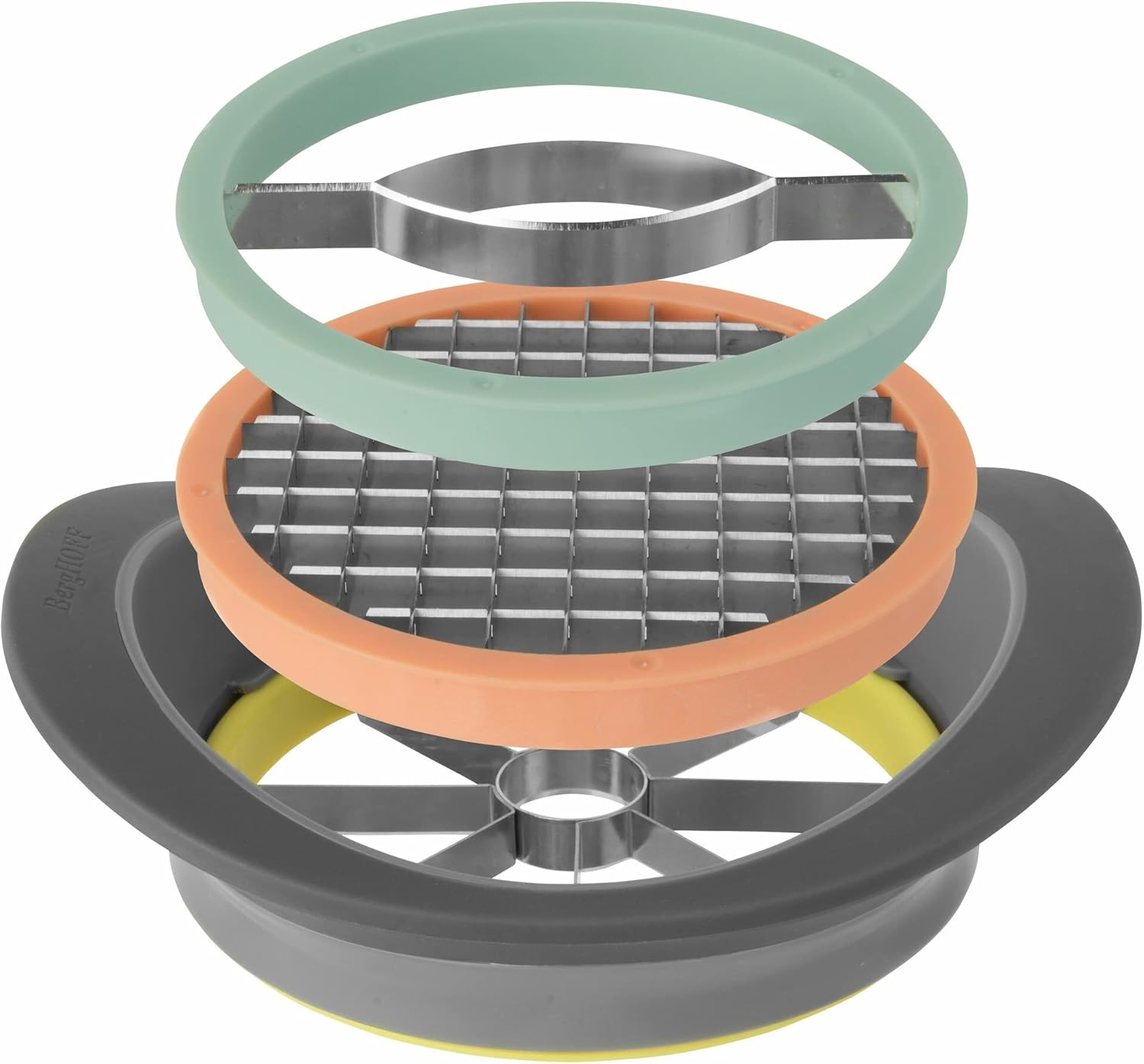 - Slicer body 7" x 5.75" x 2", Cutter insert mango 5" x 5" x 2", Cutter insert apple 5" x 5" x 2", Cutter insert potato 5" x 5" x 2", made with stainless steel blade, soft-touch reinforced glass-fiber PP handle, satin finish. Apple corer slices and cores apples in one press.