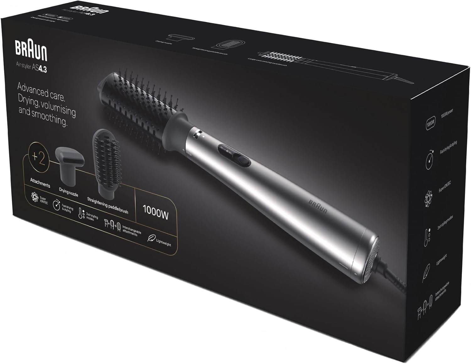- 1,000 watts of power and light weight: The Braun Air Styler AS4.3 has 1,000 watts of power, yet remains lightweight for comfortable handling during styling sessions.