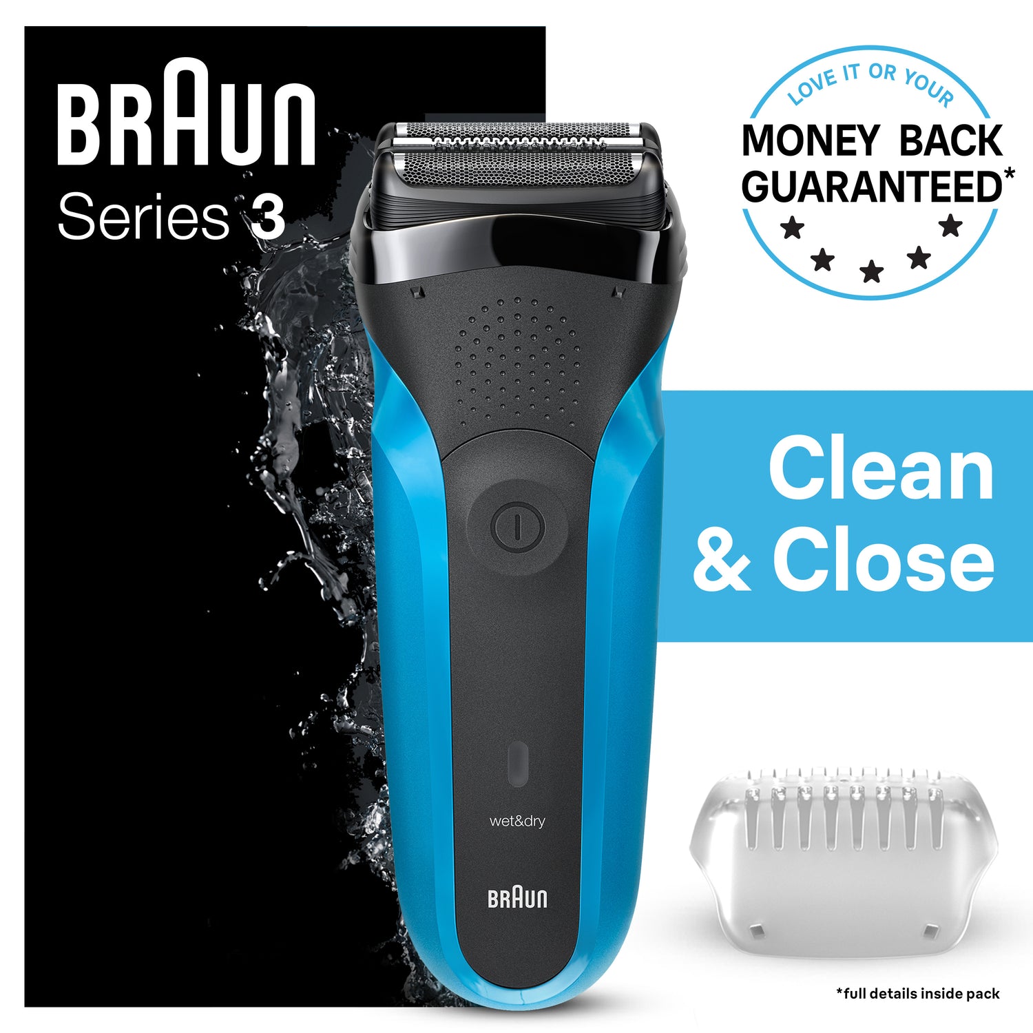 • Close & clean shave: Series 3 is equipped with 2 Braun foil shaving elements and 1 center trimmer to shave longer hairs.