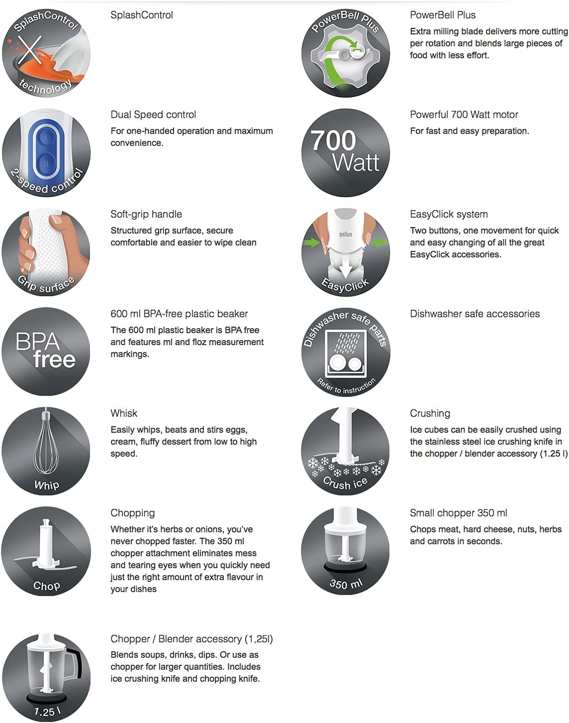 - Comes with a Chopper (350 ml), 1.25 Jug Blender/chopper, whisk, 600 ml BPA Free