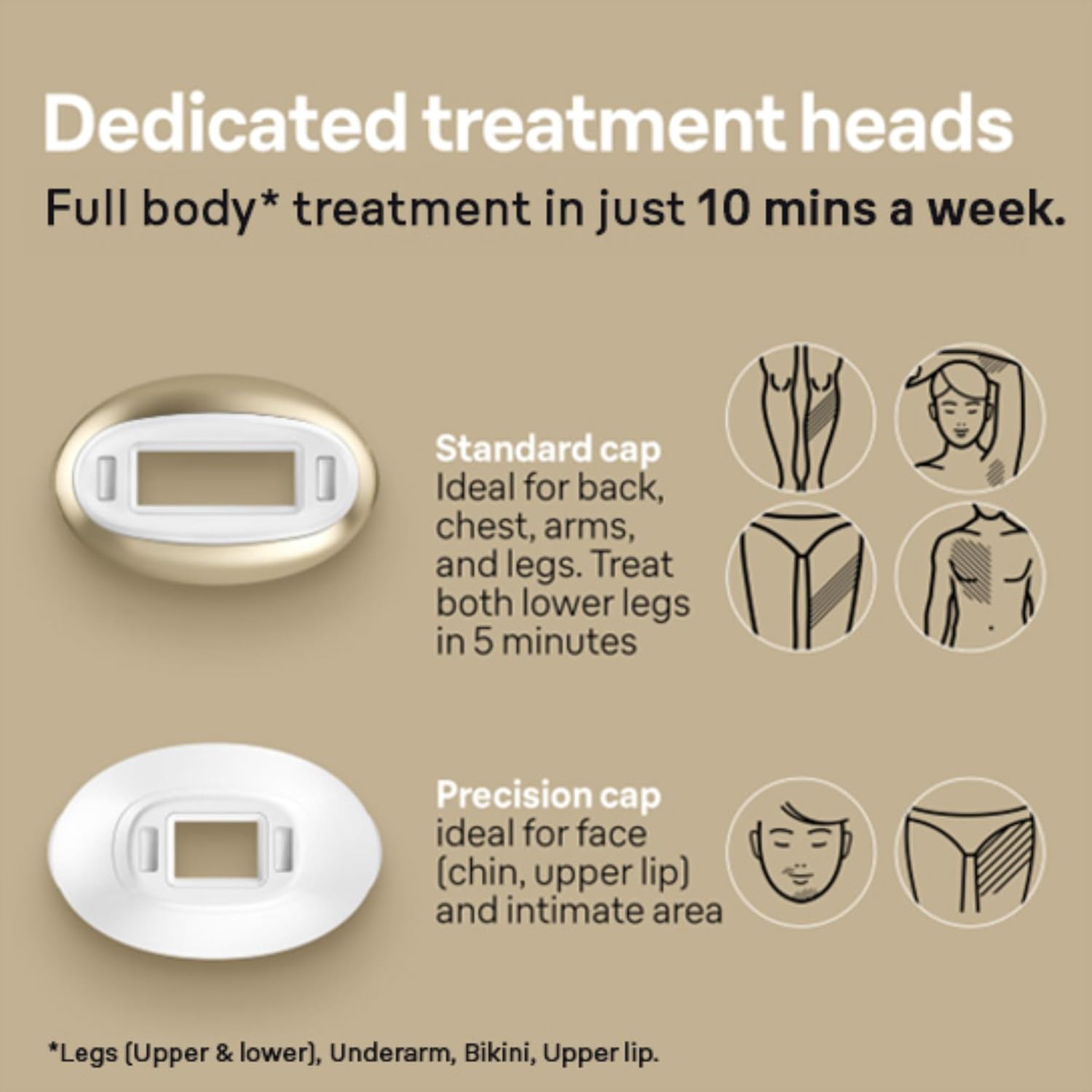 - Multiple heads for head-to-toe treatment. Standard head for armpits & lower legs and a precision head for face and bikini areas.