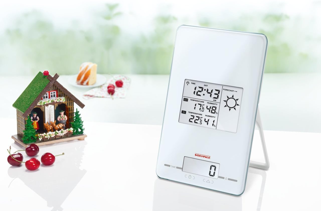 - 5 in 1: digital kitchen scale, weather station, radio-controlled clock, timer, and alarm in one