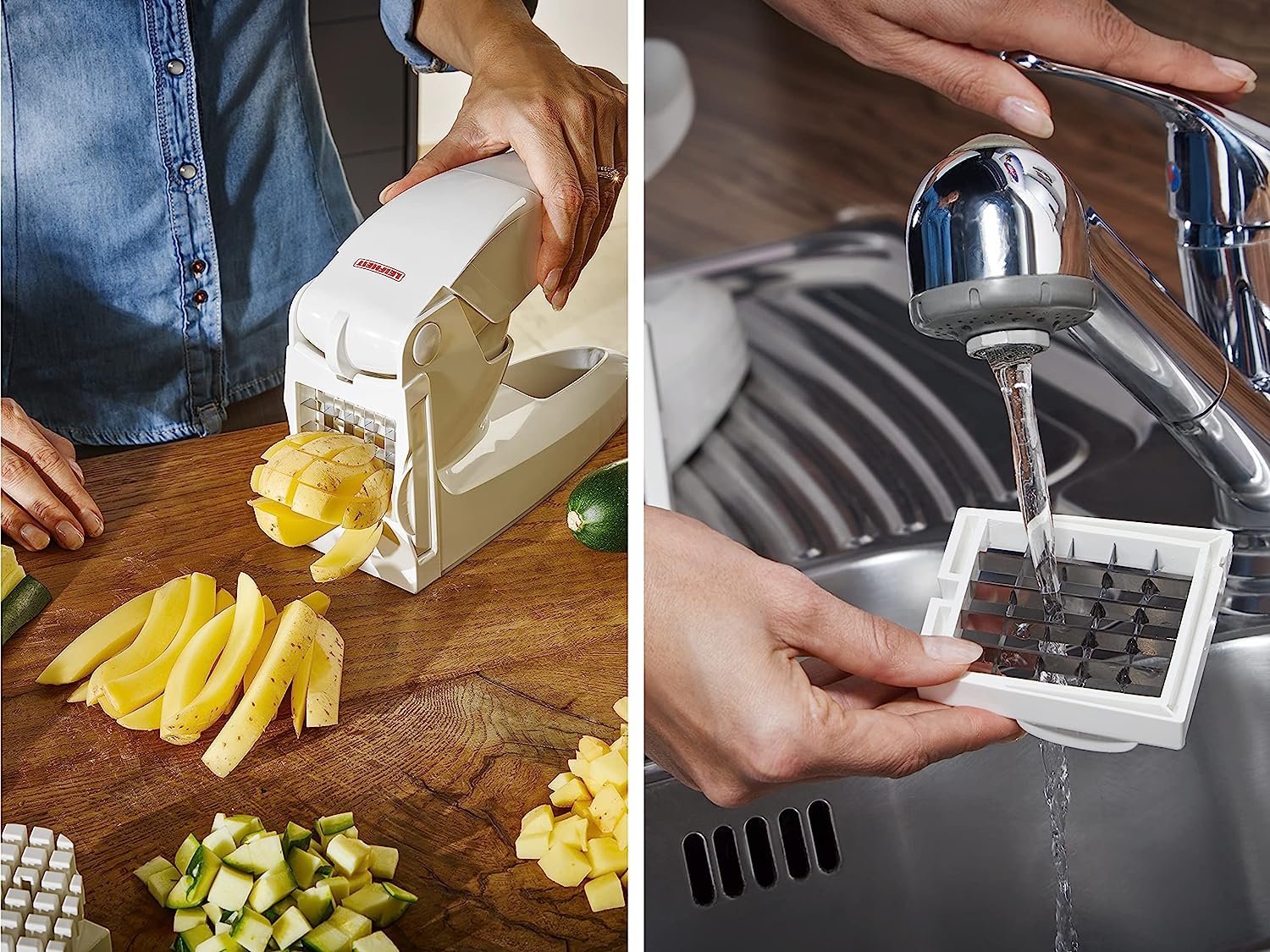 - Easily cut potato and vegetable sticks with 2 blade inserts