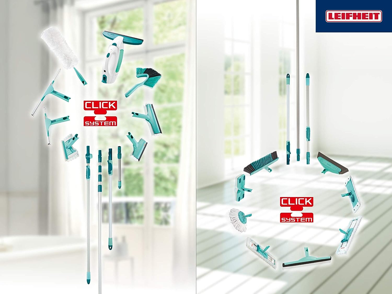 • Click system: the squeegee has the patented Leifheit click system: thanks to the special attachment, different handles are possible in combination with the window cleaner.