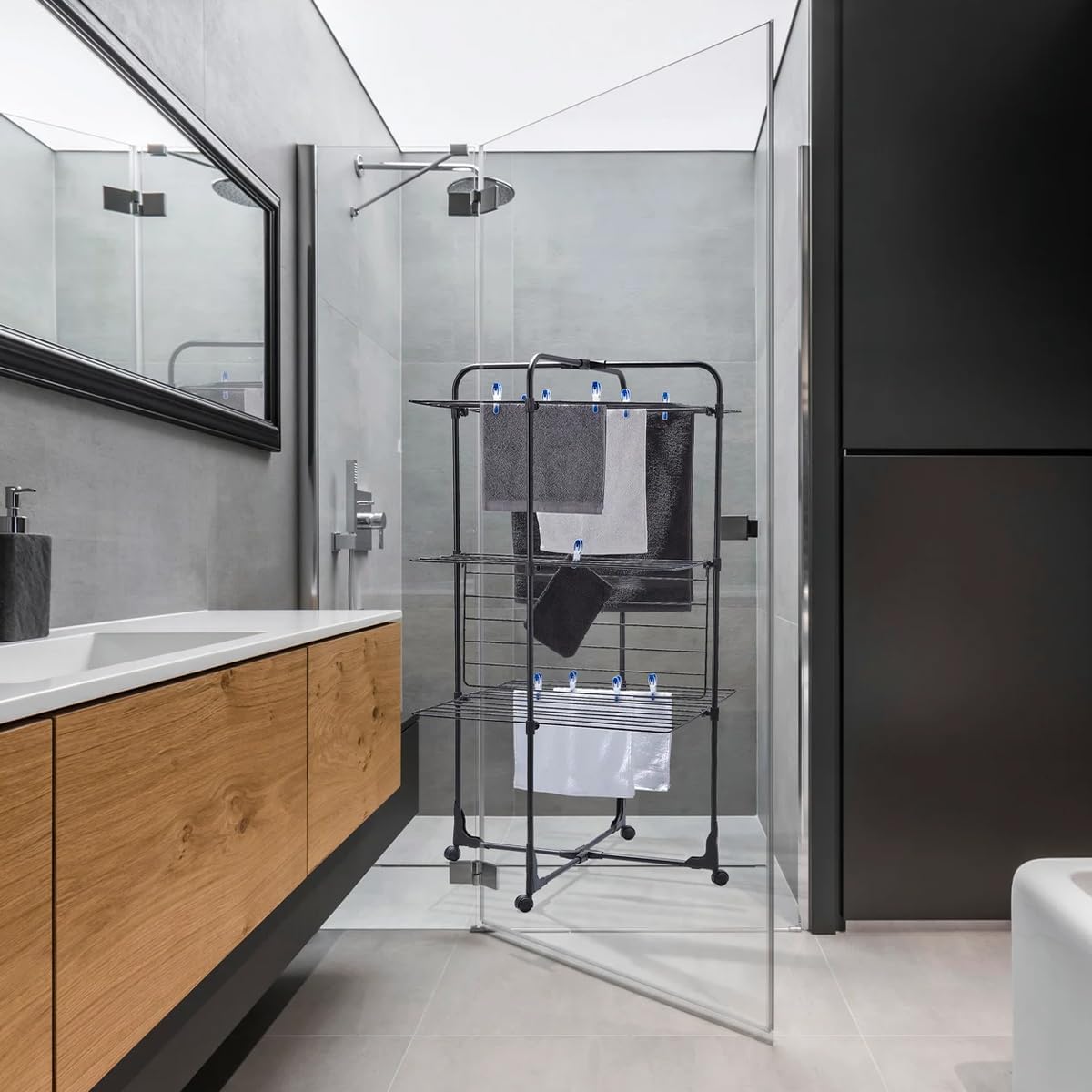 • Folding shelves - Moveable tiers allow frame to fold in half vertically. Space saving, fits inside shower. Dry long items without touching the ground