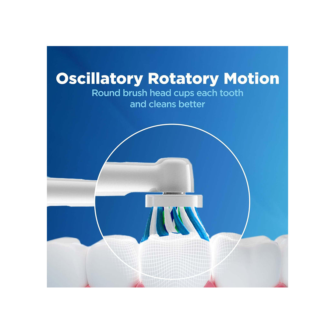 - Round brush head removes more plaque versus a regular manual toothbrush