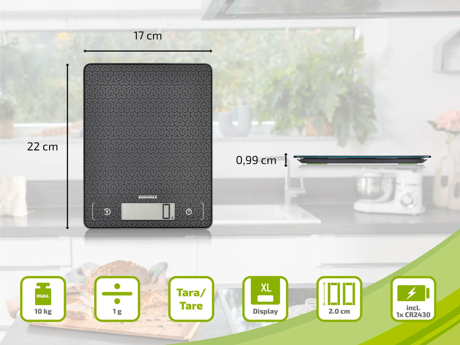 - Digital kitchen scale with a high load capacity of 10 kg and an accuracy of 1 g