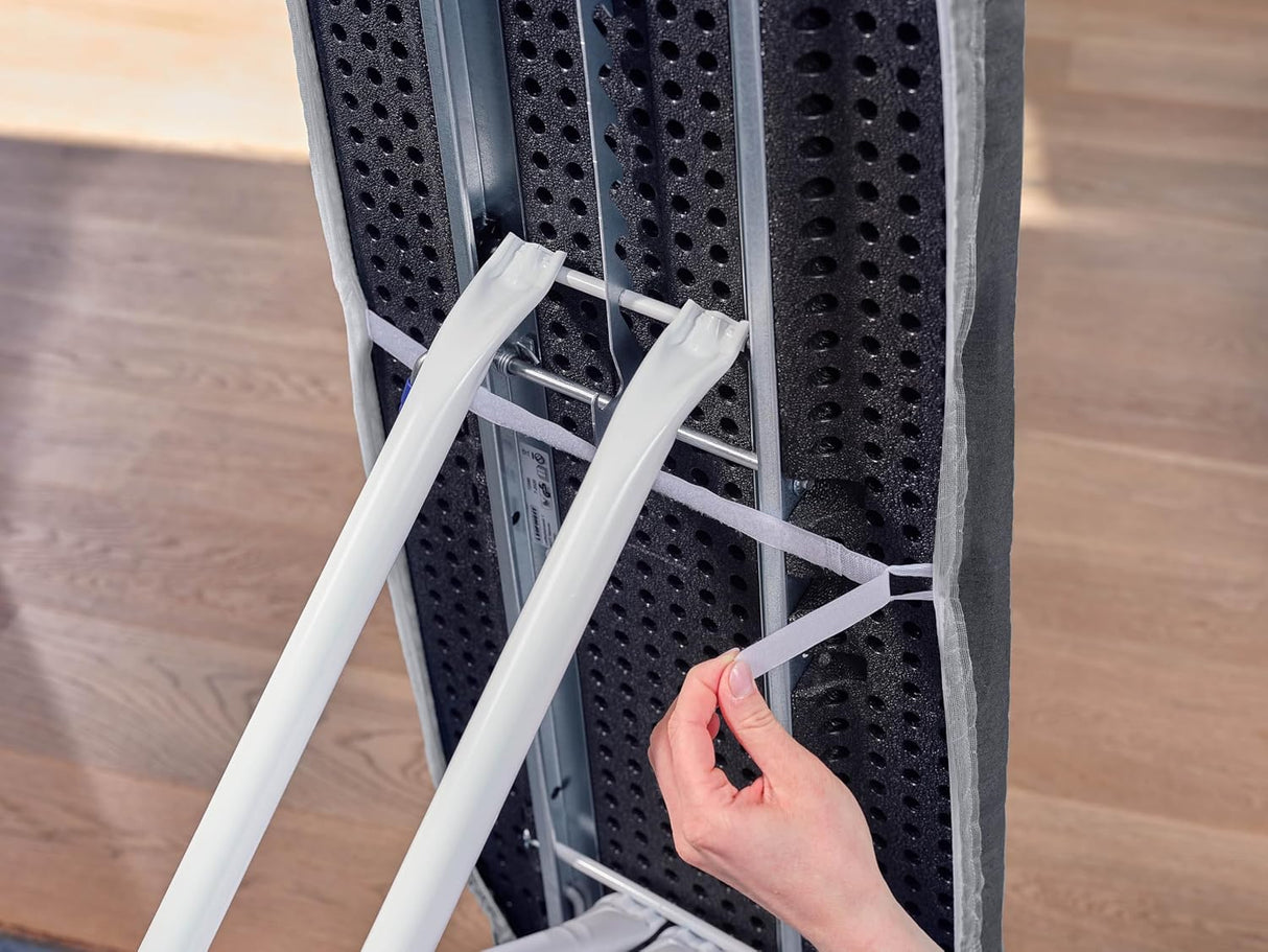 - Tight ironing cover - easy to put on and a tight fit are achieved by an elastic cord as well as a tensioning clip and easy fit Velcro fixation