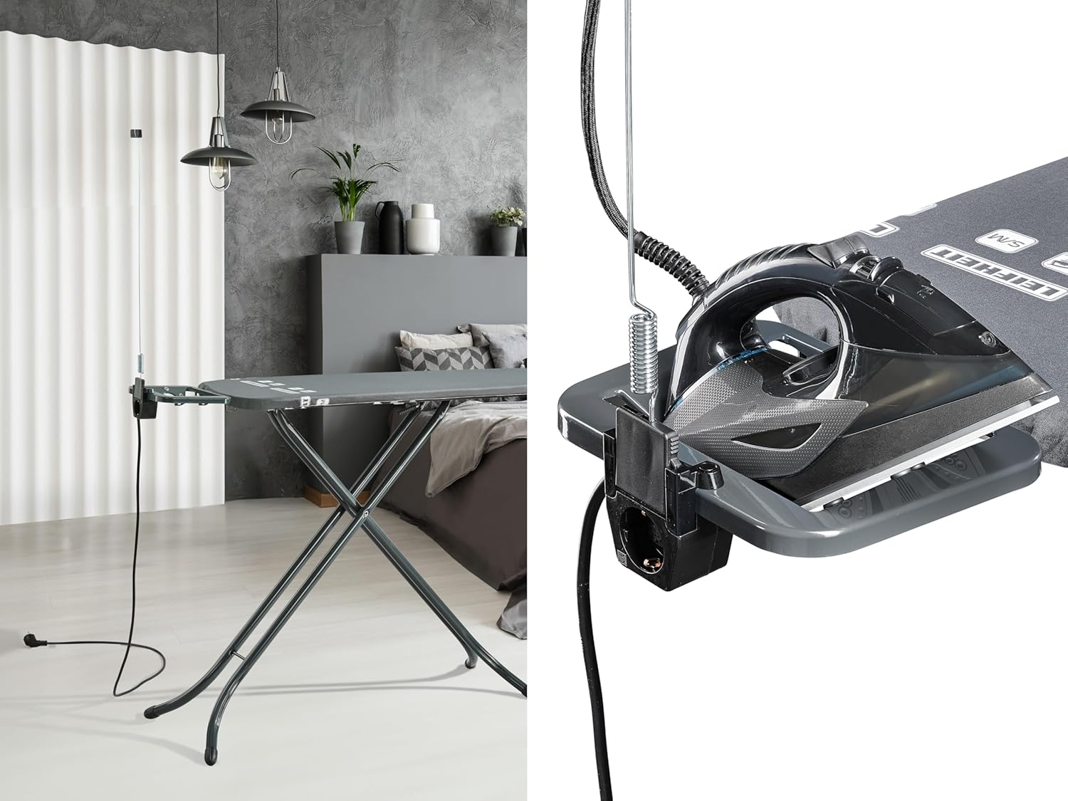 - Fixed iron rest with electric wire guide and plug to safely place your iron