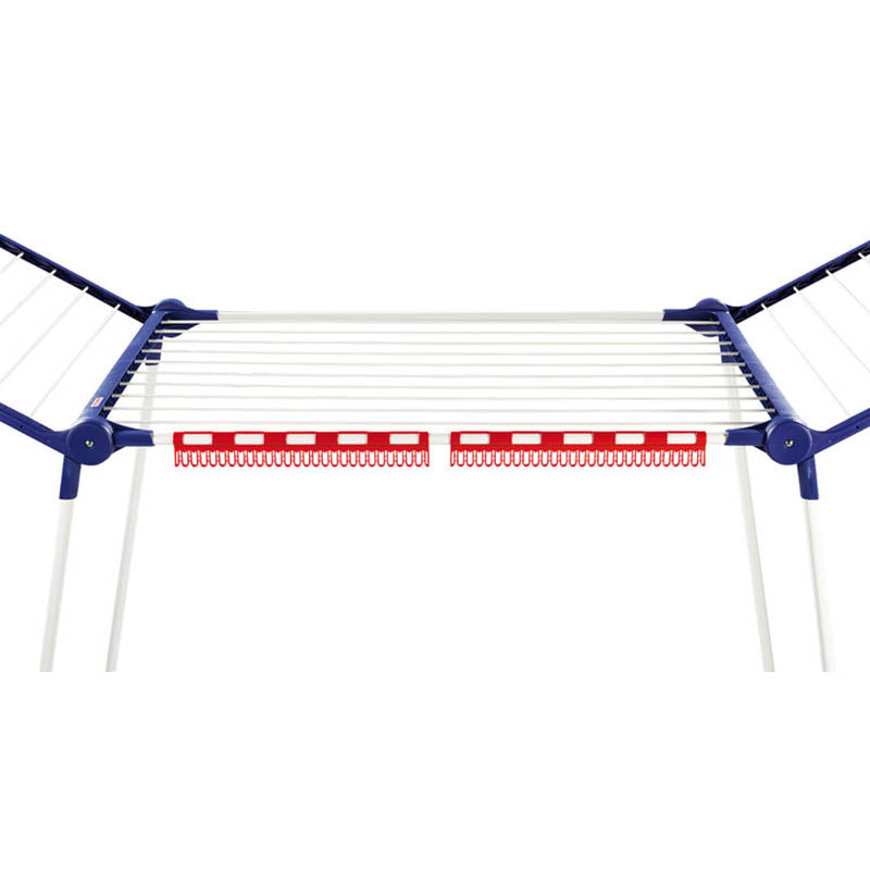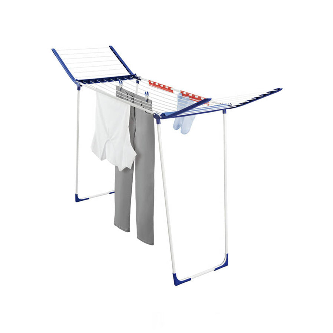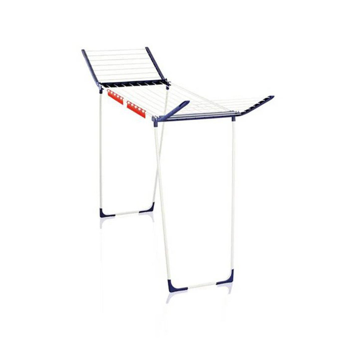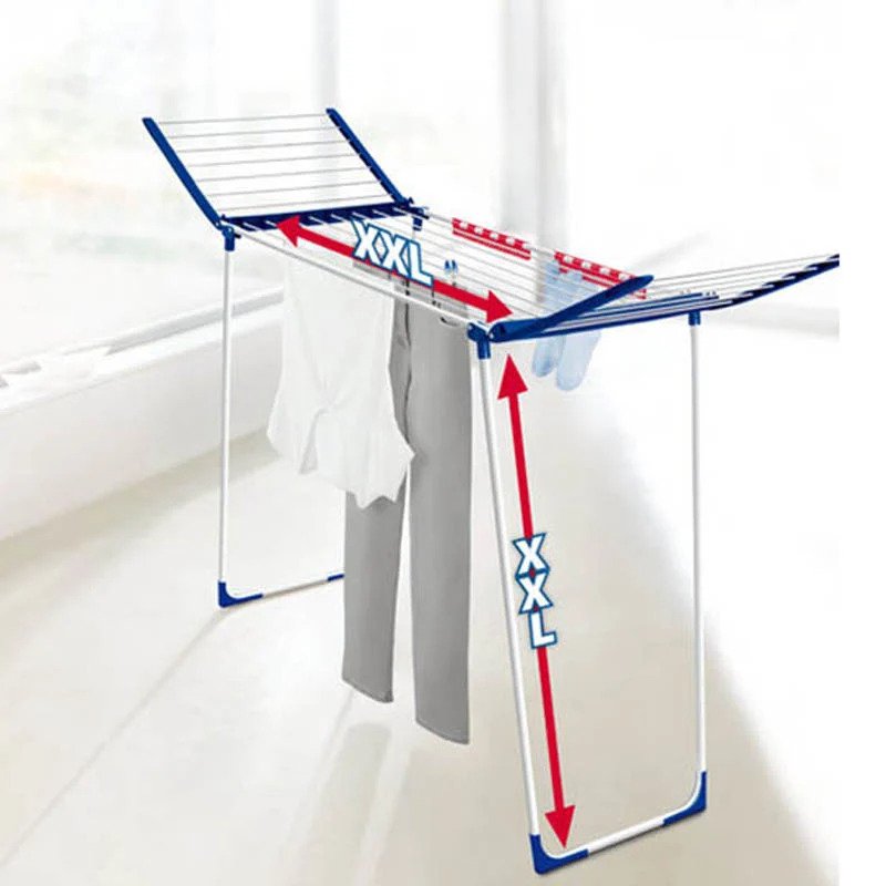 Long trousers or long dresses - it makes no difference: the Pegasus 180 Maxx winged laundry drying rack is the first dryer on which even XXL laundry can dry comfortably - without swishing on the floor and without creases from being pushed together. The Maxx offers an extra-large area in terms of both height and width. So it's not only long items of laundry that can be hung up with no contact with the floor; wide items of laundry will also fit on the 43.3 inch-long drying rods, or even several items next to one another. Even hanging them up is more convenient: the XXL height of 42.52 inch is ideal for working upright and without causing back pain. Simply practical: with a width of just 21.65 inch the Maxx fits comfortably through every doorway. With its two fold-out wings and a drying length of 19.7 yard, the Pegasus 180 Maxx offers space for two washing machine loads. Two hangers for small items are included so you quickly hang up socks, briefs etc. And save space at the same time. With its powder-coated drying rods, the Pegasus 180 Maxx is suitable for both indoors and outdoors, where it will stand up securely even in windy conditions.18-metre line lengthDimensions: H 108 x W 196 x 55cm