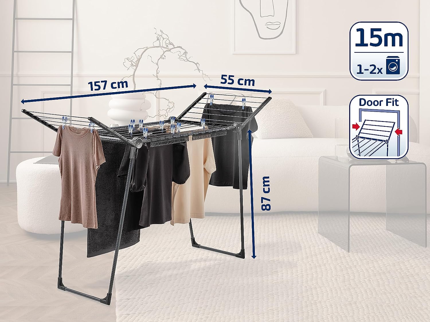 - A whole 15 m drying line offers plenty of space for hanging laundry. Socks or briefs can be attached to the practical 2 small parts holders to save space