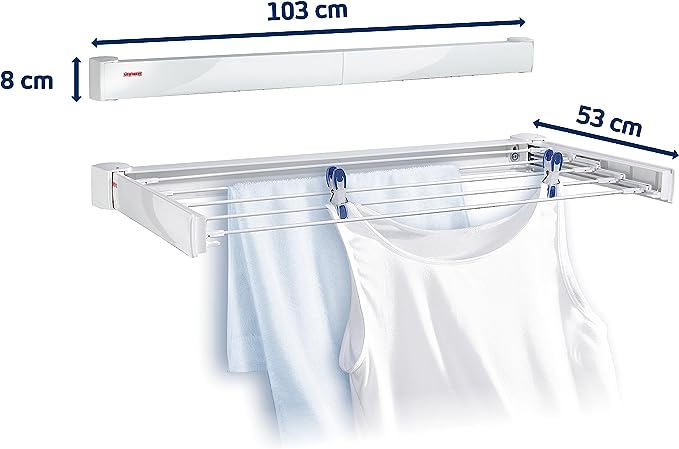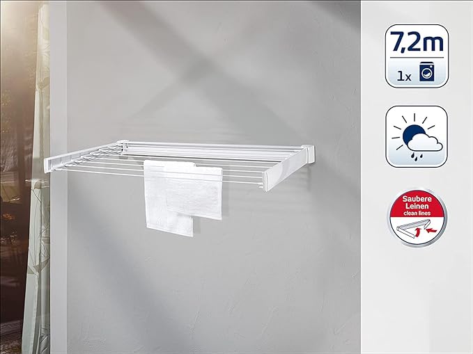 - The material of the wall mounted laundry drying rack offers long-lasting protection against rain and dirt. When folded up, it takes up little space